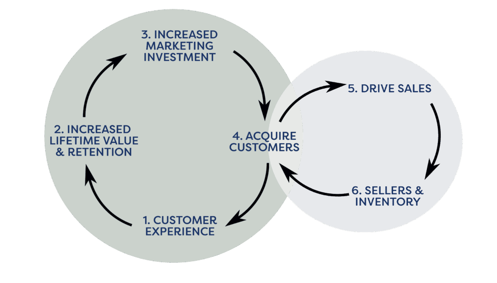 This model shows how the Farfetch marketplace works, particularly focusing on the demand side of the network. Customer experience improvements are leveraged to consistently drive traffic, improve the selection of goods and cost structure, decrease prices, and contribute to the flywheel spin.