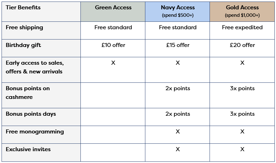 Another notable transformation involves the departure from the traditional loyalty model that restricted perks to J.Crew credit cardholders. In 2018, J.Crew introduced J.Crew Rewards, a cardless, points-based programme allowing customers to earn one point for every dollar spent. However, in 2022, this was revamped and renamed J.Crew Passport, a free-to-join hybrid programme exclusively for U.S. customers. This enhanced programme retained the points-based structure but introduced three distinct tiers (green, navy, and gold access) and introduced added incentives such as complimentary monogramming. As members accumulate points, they ascend through the tiers, unlocking access to progressively exclusive benefits and rewards, including coveted invitations to special events. Additionally, J.Crew credit card holders, by virtue of their card membership, gain direct entry to the second tier, accumulate points at an accelerated rate, and enjoy exclusive benefits like complimentary alterations, elevating the overall loyalty experience.