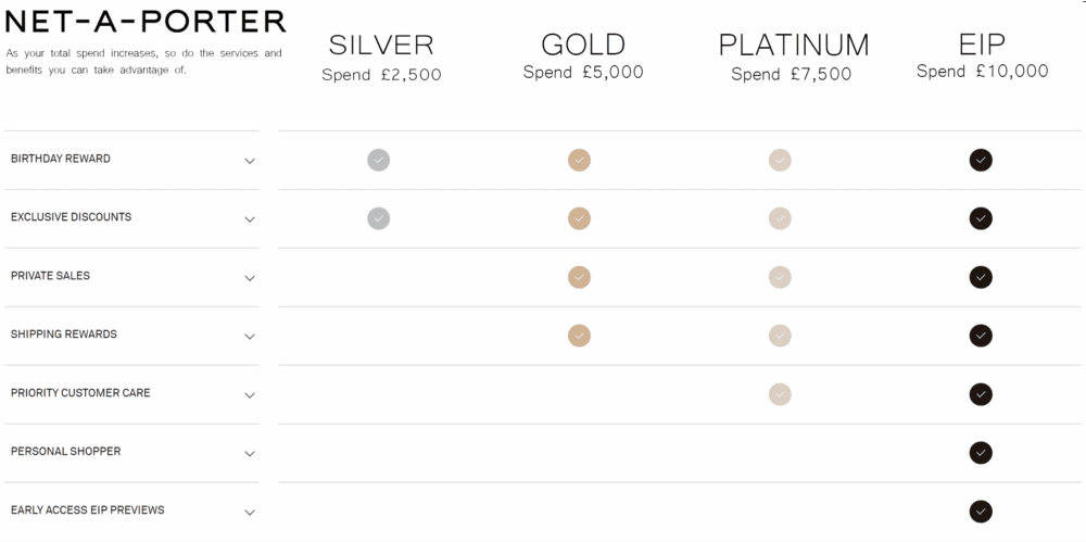 Undoubtedly, shopping can be stressful, and deciding where and how to spend your money can be overwhelming. Personal shoppers eliminate the paradox of choice, transforming the shopping experience into a smoother and more enjoyable process. Net-a-Porter Rewards offers customers a personalized shopping experience, a privilege sought after by those at lower tiers and enjoyed by EIPs.
