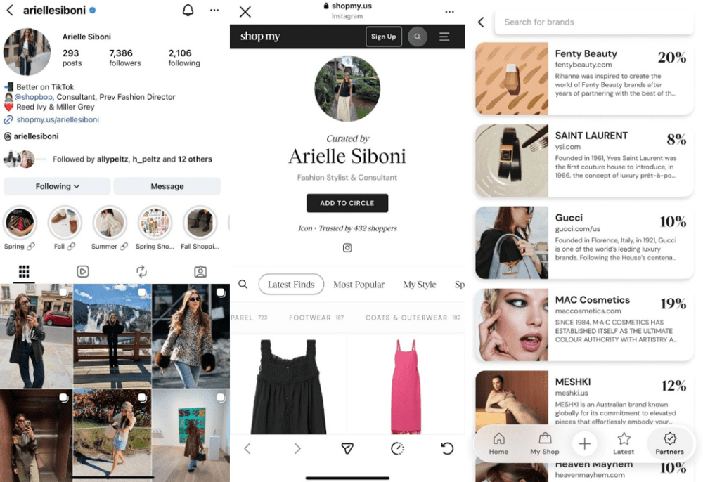 (Image Reference: Arielle Siboni Instagram page, ShopMy Bio linked page, and ShopMy Partners page)
