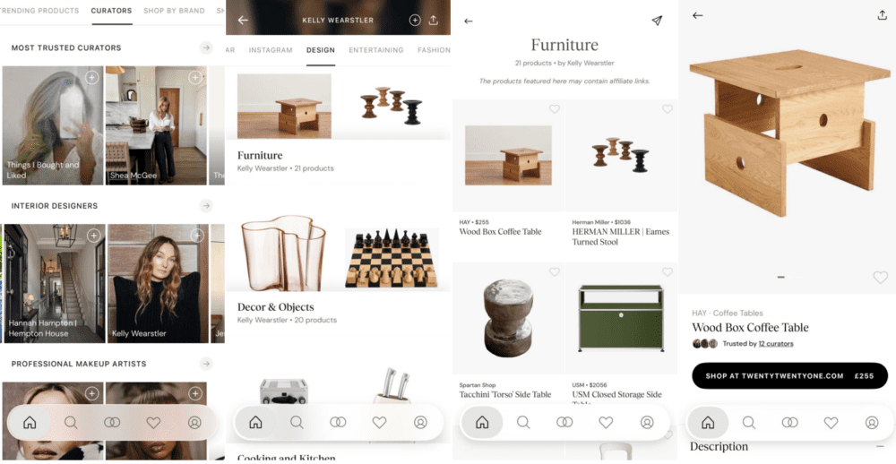 (Image Reference: ShopMy Curators page, Kelly Wearstler’s ShopMy Shelves, Furniture, and example product)